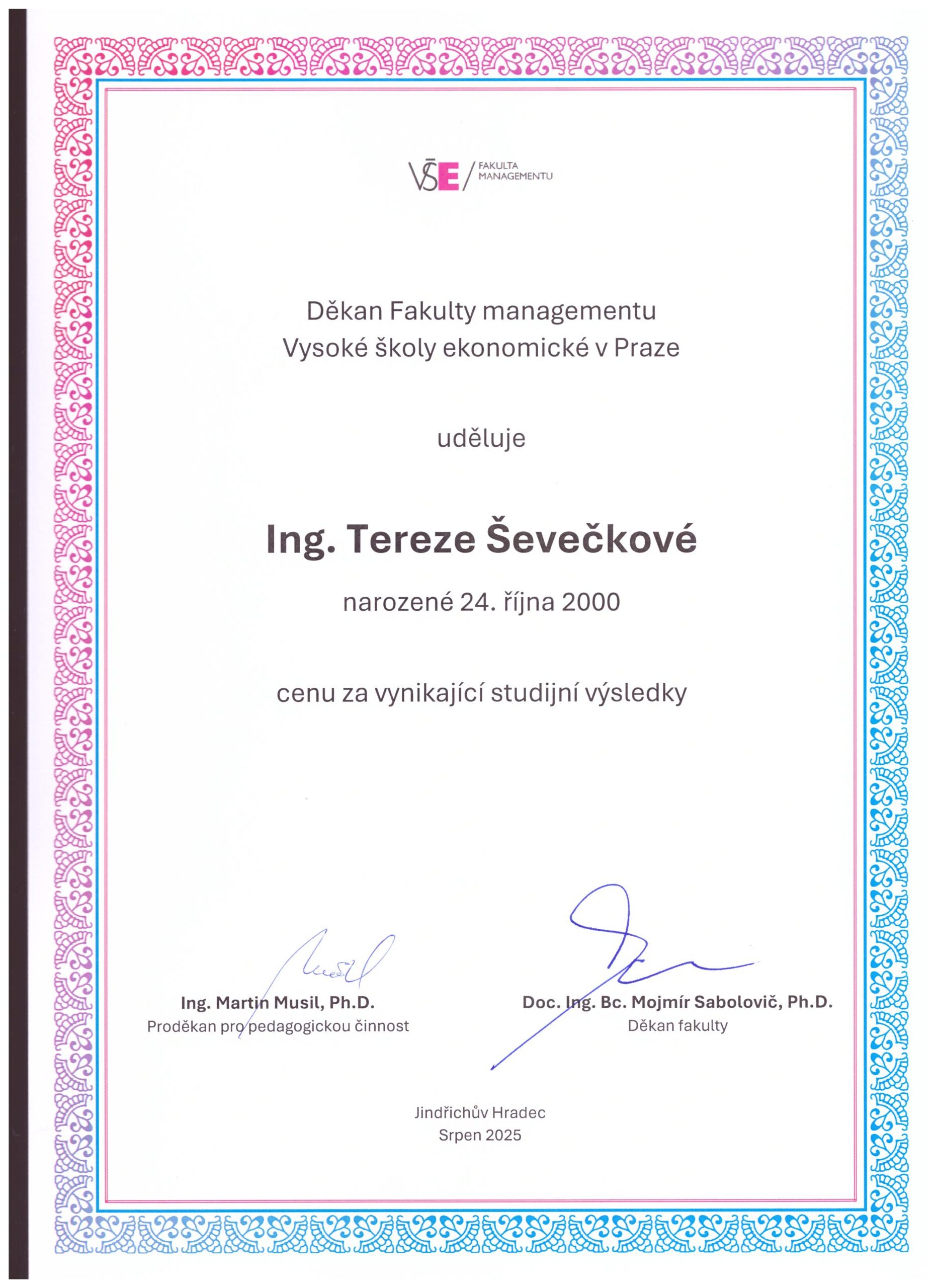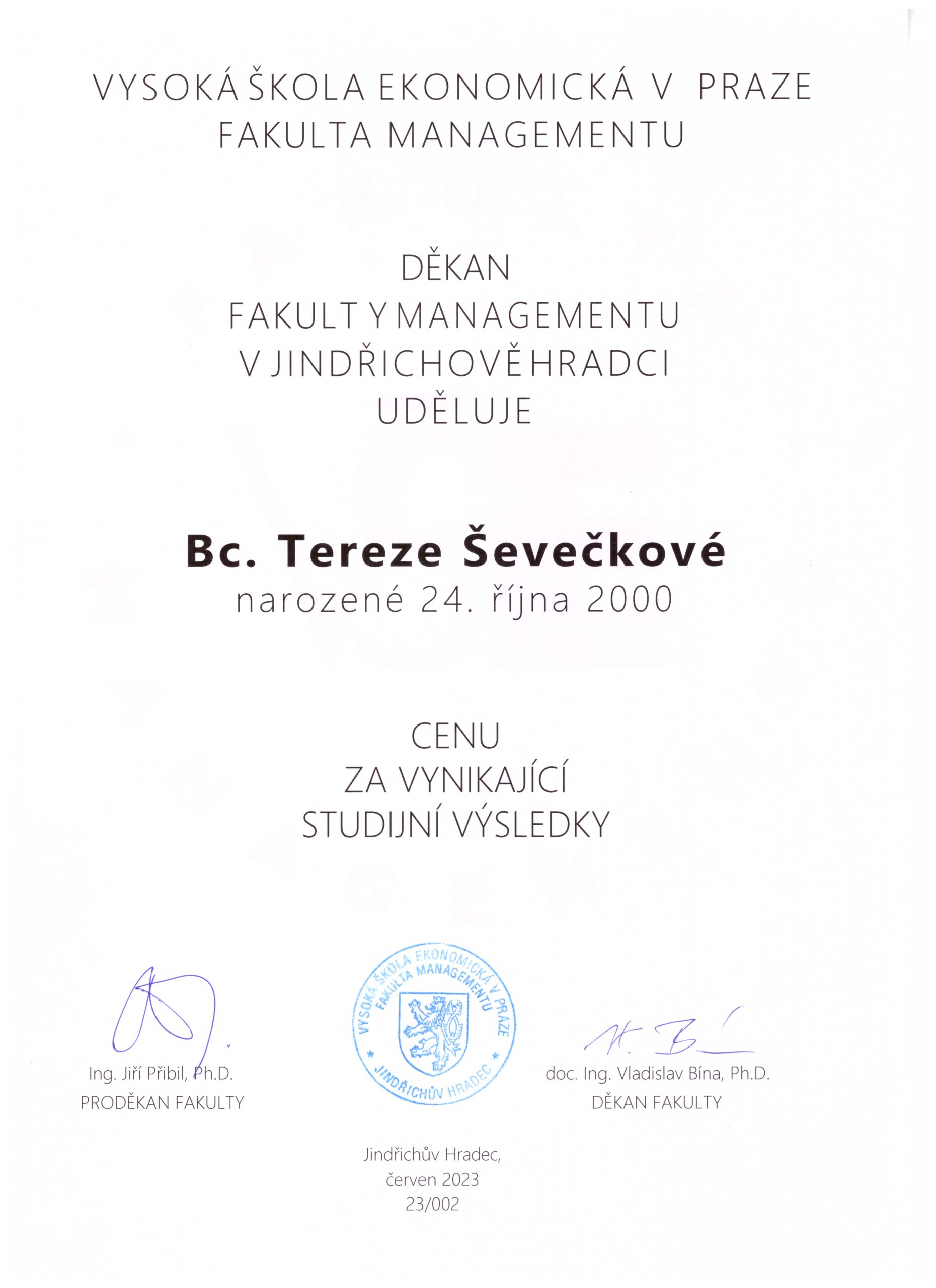 2023Cena za vynikající studijní výsledkyVysoká škola ekonomická, Fakulta managementuOcenění bylo uděleno pěti nejúspěšnějším studentům bakalářského studia na základě jejich studijních výsledků.Zobrazit ocenění
