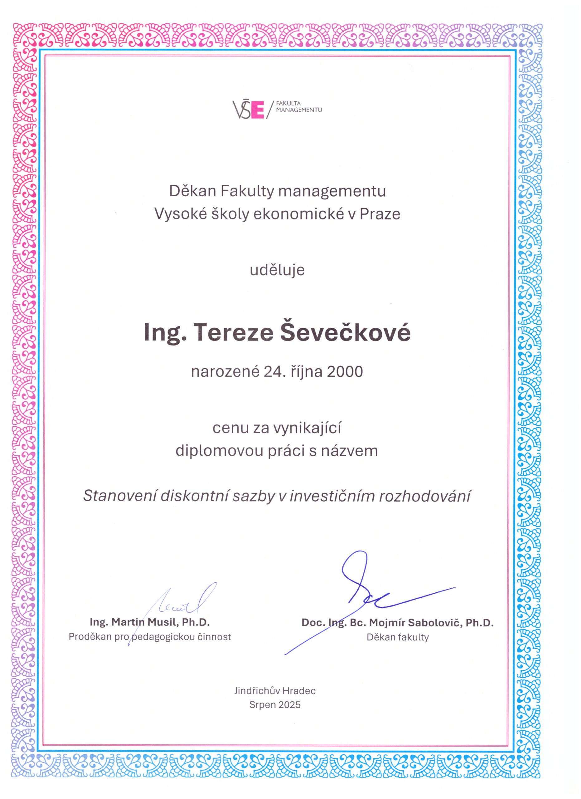 2025Cena za vynikající diplomovou práciVysoká škola ekonomická, Fakulta managementuOcenění děkana fakulty za diplomovou práci na téma Stanovení diskontní sazby v investičním rozhodování.Zobrazit ocenění -